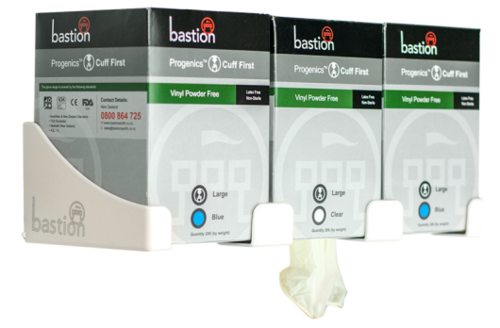 Using the Bastion Progenics glove dispenser and a special sized box, the Vinyl gloves can be dispensed cuff first. Dispensing the glove cuff first helps to reduce the contamination normally caused by the traditional glove dispensing methods. This dispensing method is an effective infection control solution for use where hygiene is critical.